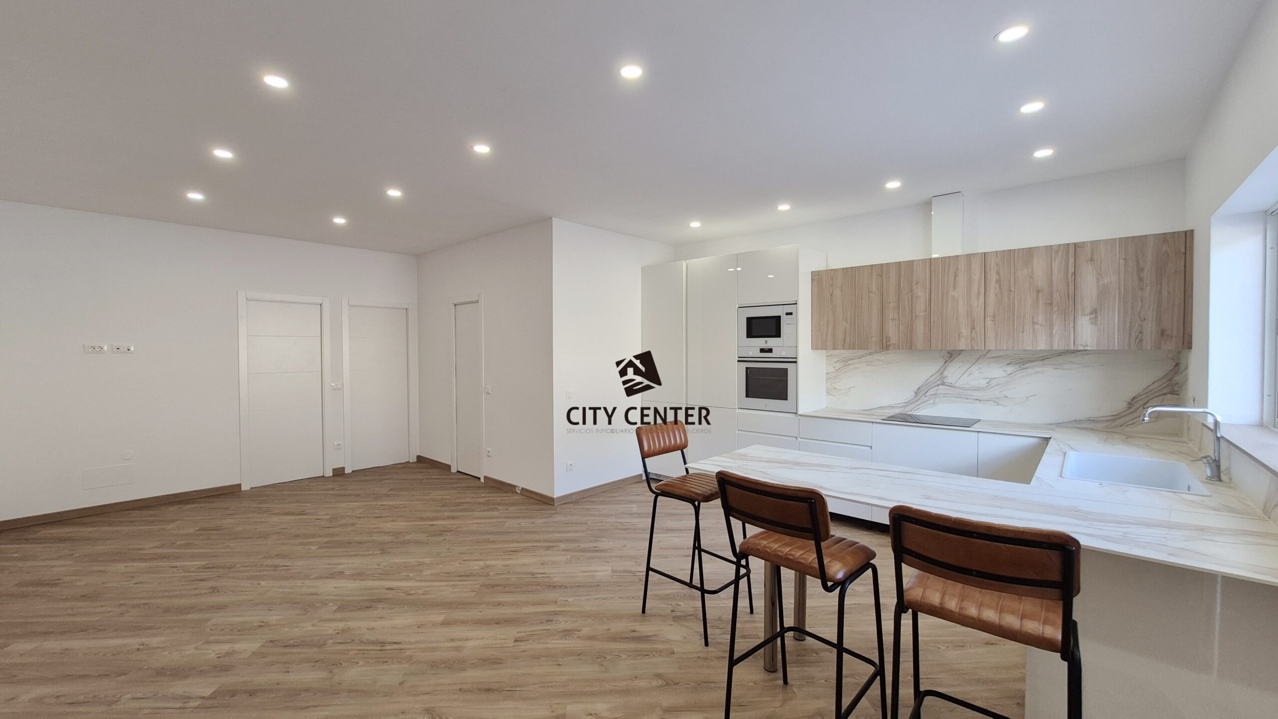 Cocina abierta al salón-comedor, equipada con electrodomésticos de alta gama